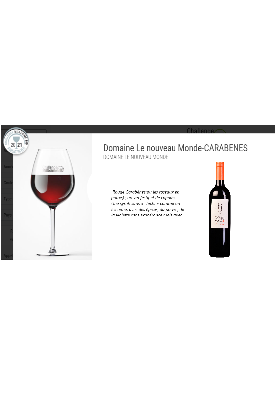 Description : Un nez aux notes florales de violette et de fleurs d'oranger, rejoins par des notes poivrées, une bouche ronde et gourmande aux petits fruits noirs et à la finale épicé, un plaisir immédiat s'accordant avec tout.